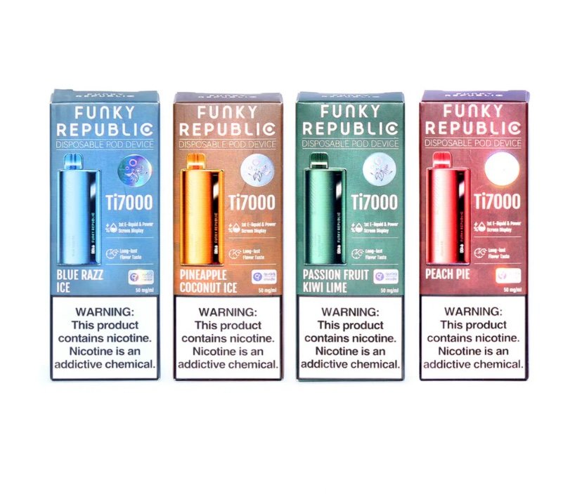 & Free ShippingMade by ELFBAR, Funky Republic Ti7000 ( 7000 Puff ) Smart Disposable Device is an innovative disposable that features a liquid and battery life indicator display with long-lasting flavor and 12.8ml of 5%nic that lasts approximately 7000 puffs.