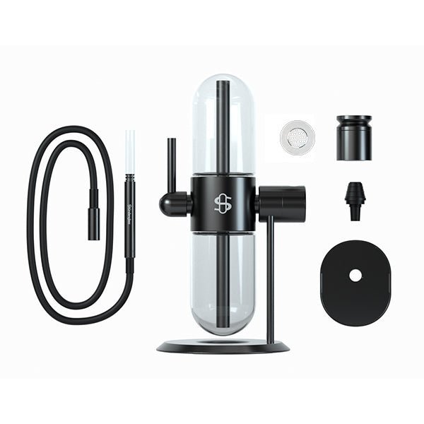 Designed for functional versatility, the Stündenglass Gravity Infuser is a complete set that includes an aluminum bowl kit and a glass liner, but can also connect to any smoking or vaporization device with a 14mm male joint. Included is a 3-foot silicone hose that can be connected for direct draws, though a steady stream of smoke through the 45° adjustable mouthpiece affords the optionality for entirely contactless consumption.